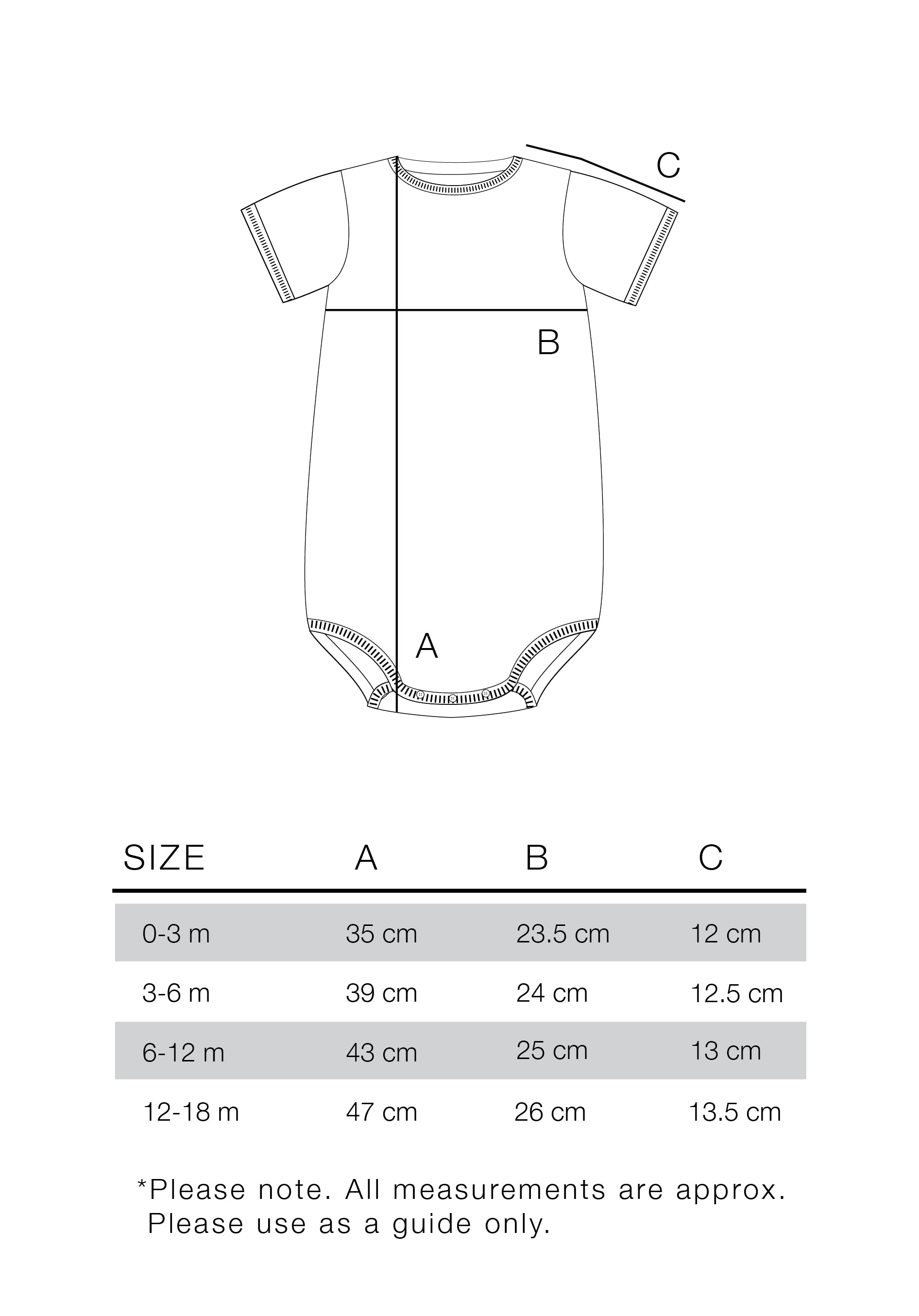 Our size guide is only approximate measurements, taken on a flat surface and are of the front of the garment only. Please use this as a guide.