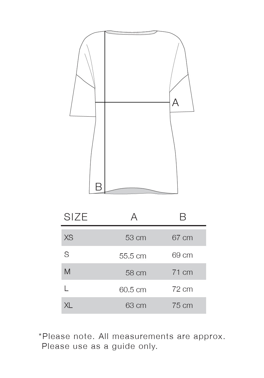 Please refer to the image at the end of the product image carousel for further details on measurements. Our size guide is only approximate measurements, taken on a flat surface and are of the front of the garment only. Please use this as a guide.