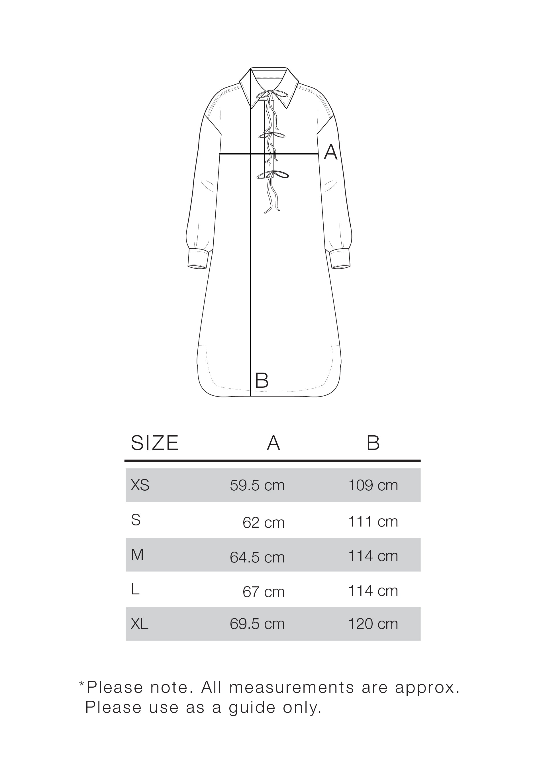 Please refer to the image at the end of the product image carousel for further details on measurements. Our size guide is only approximate measurements, taken on a flat surface and are of the front of the garment only. Please use this as a guide.
